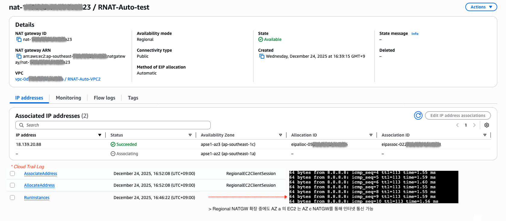 - Regional NAT Gateway 가용 영역 a에 해당 EIP 할당 (Edit IP address associations 메뉴)