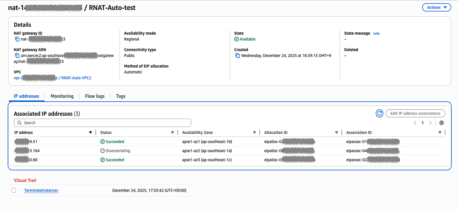 <그림 7. Automatic Mode 사용 시 축소 후 재 생성된 NATGW의 EIP 변경>