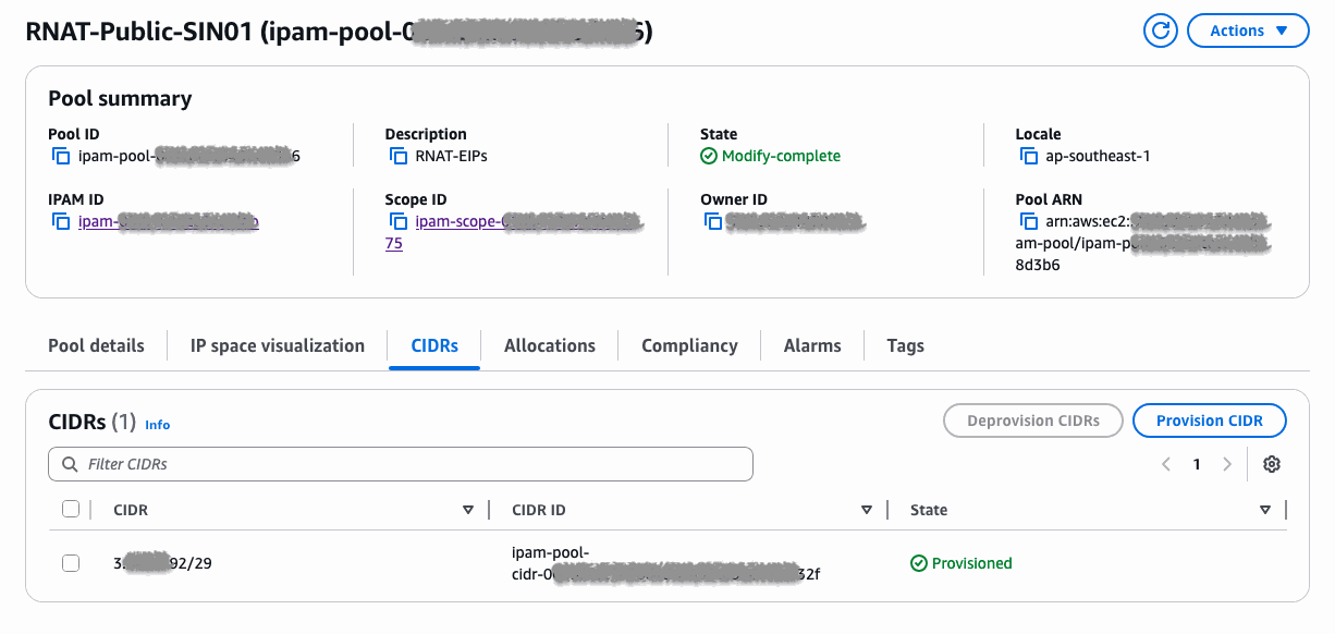 * BYOIP나 Contiguous IPv4 를 IPAM Pool 로 생성하시어 이를 통해 IPAM Allocation Policy 를 생성한 후 Target Tab 에서 계정을 활성화 하시면 Regional NAT 가 해당 IP Pool 에서 EIP를 할당받아 확장/축소를 하게 되어 해당 Pool 의 CIDR 를 NATGW를 통한 외부통신에 고정적으로 사용할 수 있습니다.