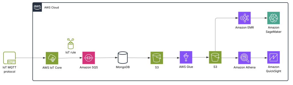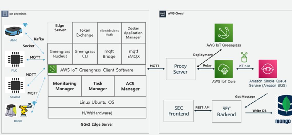 삼성전자의 아키텍처는 로봇 설비의 데이터를 안정적으로 수집하고 저장하는 데 초점이 맞춰져 있었습니다. 현장의 로봇(AMR, PLC 등)에서 발생하는 데이터는 AWS IoT CoreGreenGrass를 통해 수집되어 Amazon SQS를 거쳐 운영 DB인 MongoDB에 실시간으로 적재되고 있었습니다. 하지만 이 단계까지는 데이터가 쌓이고만 있을 뿐, 이를 효과적으로 추출하여 분석하거나 시각화할 수 있는 체계는 부재한 상황이었습니다.