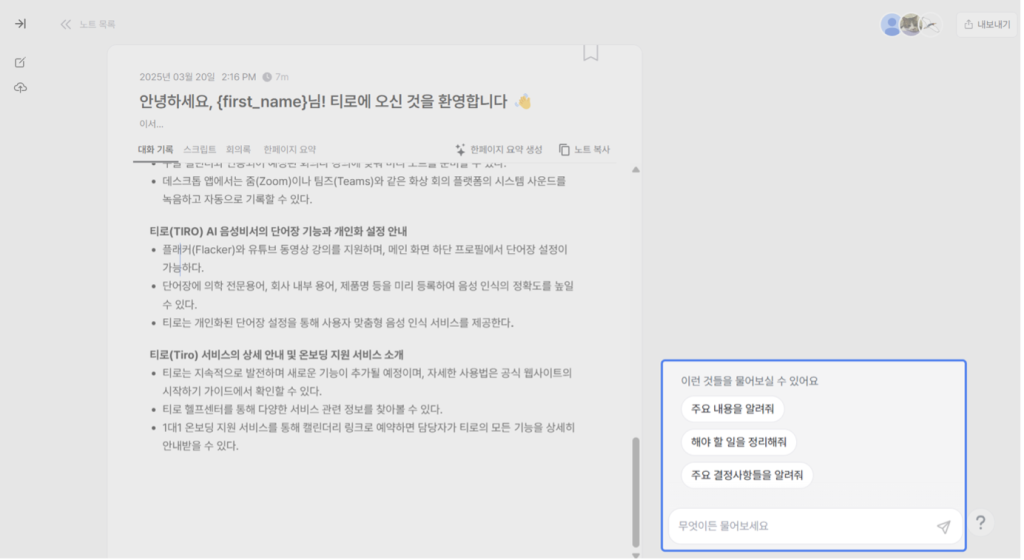 매일 쏟아지는 회의 내용, 강의 녹음, 팀 미팅 기록들이 쌓여가면 쌓여갈수록 필요한 정보를 빠르게 찾는 것은 점점 더 어려워집니다. “지난주 온보딩 프로젝트에서 논의된 핵심 이슈가 뭐였지?”, “지난주 A 기업과의 미팅에서 결정된 주요 사항들이 뭐였지?”와 같이 대화 기록을 기반으로 한 고-맥락의 질문에 답하려면 수 많은 대화 기록을 일일이 찾아 봐야 하는 번거로움이 생기기 마련 입니다.