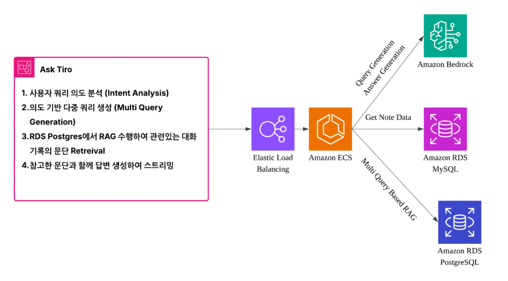 이번 글에서는 티로가 대화 기록 기반 질의응답 시스템인 “Ask Tiro” 를 어떻게 구현했는지, 그리고 Amazon Bedrock과 RDS를 활용하여 어떤 방식으로 안정적으로 서비스를 제공하며 사용자 경험을 극대화했는지에 대해 자세히 살펴보겠습니다.
