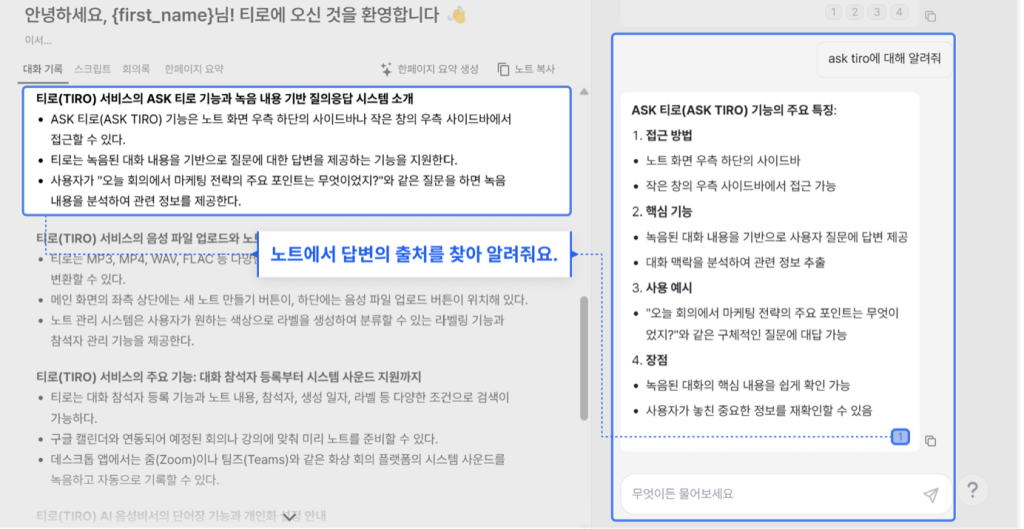 티로(Tiro) 는 이러한 문제를 해결하면서 동시에 사용자가 티로를 사용해 중요한 대화 기록을 쌓아갈 수록, 더 큰 가치를 제공하고자 했습니다. 이를 위해 Amazon Bedrock과 Amazon RDS for PostgreSQL을 활용하여 “Ask Tiro” 기능을 개발했습니다. 이 기능을 통해 사용자들은 축적된 중요한 대화 기록들에 대해 자연어로 질문하고, 티로로부터 맥락을 이해한 정확한 답변을 받을 수 있게 되었습니다.