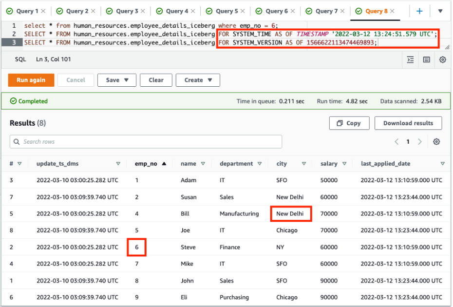 select * from "human_resources"."employee_details_iceberg" limit 10;“last_applied_date” 컬럼에는 Iceberg Table에 데이터가 저장된 시간이 표시됩니다.
