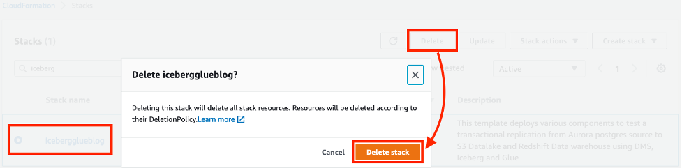 AWS CloudFormation Console에서 “Delete stack”를 선택하여 이 포스팅을 위해 생성된 모든 리소스를 삭제합니다.
