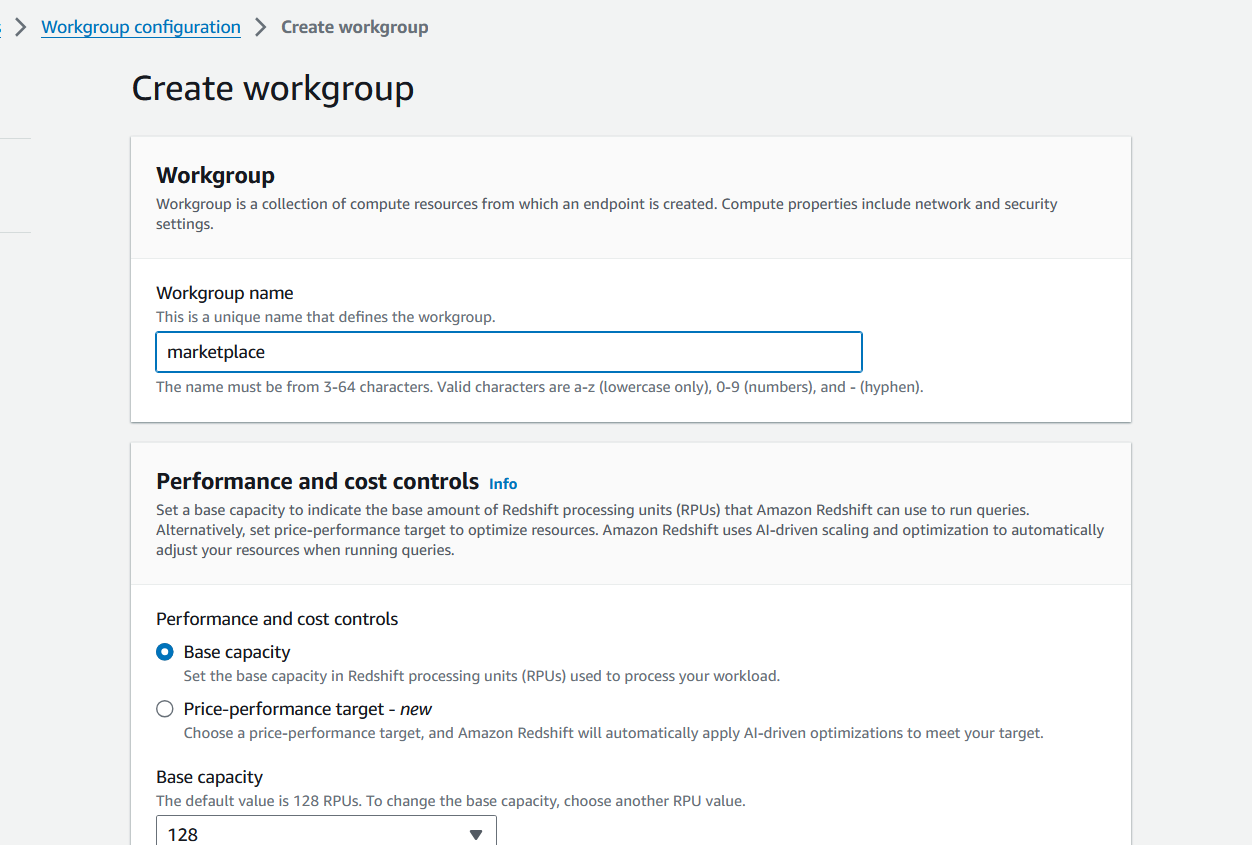 Go into Amazon Redshift and click “Create workgroup” in the Amazon Redshift Serverless dashboard. We’re going to create a new Workgroup and Namespace for our implementation: