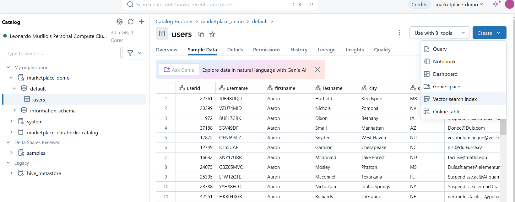 Now you can query the user data directly from Amazon Redshift inside your Databricks workspace. In order to create vector embeddings for it, though, you will need to move this data over to a delta lake table that can satisfy the requirements for automated vector index creation.