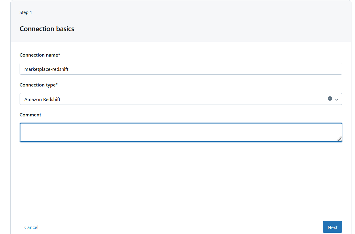 You will be asked to enter the connection details for the Amazon Redshift database. Give it a name and select Amazon Redshift for Connection type.