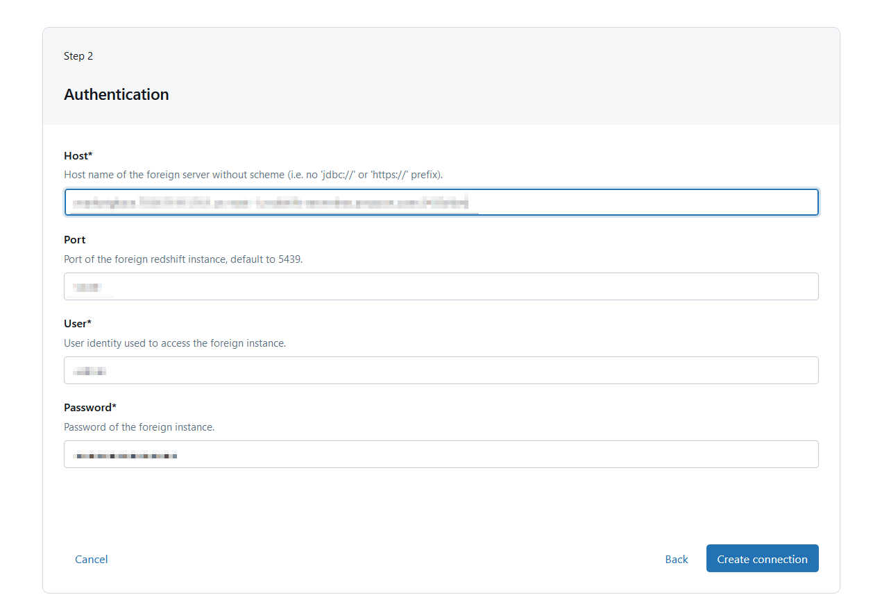 In Step 2, you will need to enter the authentication details to your Amazon Redshift Serverless service.