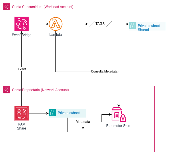 A solução automaticamente monitora três tipos de eventos através do Amazon EventBridge: a disponibilidade de novos compartilhamentos no AWS RAM, mudanças nas associações de recursos e alterações no estado de compartilhamento das subnets. Esta capacidade de resposta em tempo real permite que as tags sejam aplicadas imediatamente após o compartilhamento, trazendo visibilidade dos metadados na conta consumidora sem necessidade de acesso à conta de network.