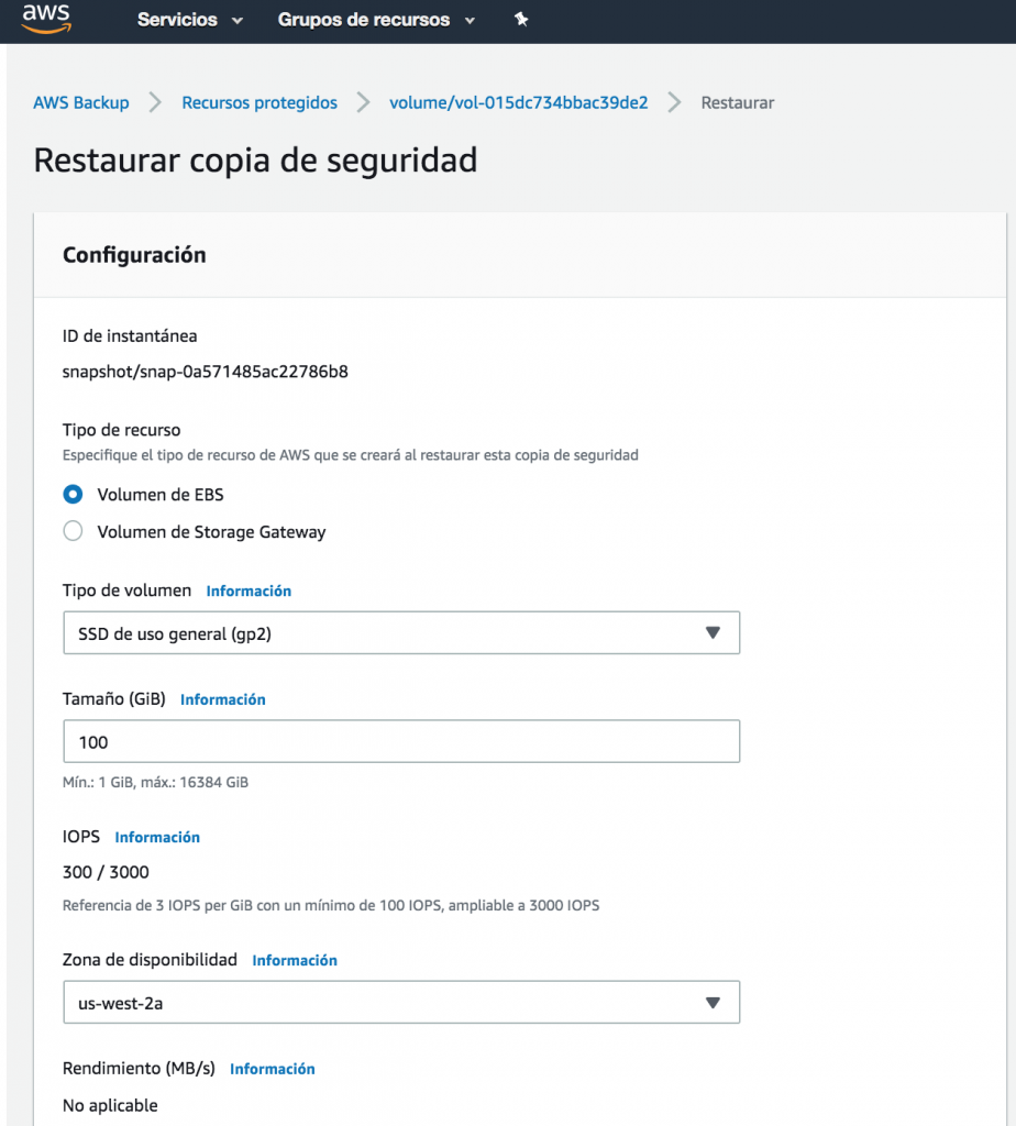 Em seguida, um portal de restauração será aberto com as opções disponíveis para o tipo de recurso, neste caso, um volume EBS (Fig. 16 e 17):