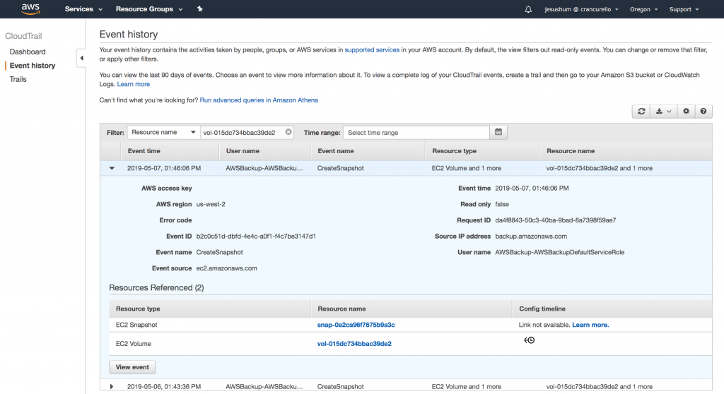 Na seção “Event History”, podemos filtrar pelo ID do recurso e revisar o histórico de chamadas da API no qual esse recurso tinha algo a fazer. Por exemplo, na imagem a seguir, podemos ver que o serviço “backup.amazonaws.com” fez uma chamada de API para criar um backup, seguindo seu calendário de backup automatizado (Fig22):