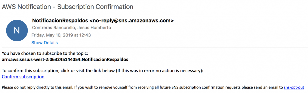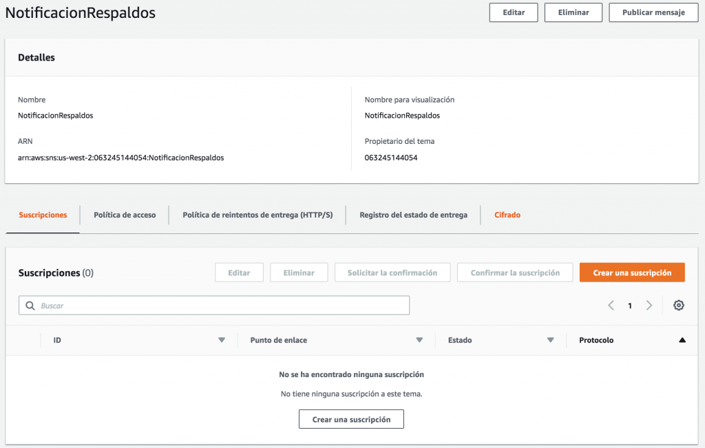 Se desejar, você pode receber notificações sempre que uma cópia de backup for criada manualmente ou através do serviço AWS Backup.