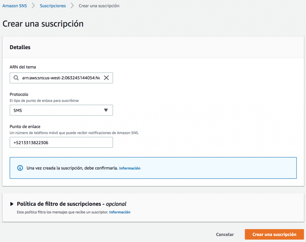 Antes de tudo, será necessário criar um Tópico de mensagem no Amazon SNS (Fig23, Fig24 e Fig25) e, em seguida, gerar uma ou mais assinaturas para este tópico. Durante o exemplo, criaremos duas assinaturas. Uma via mensagem de texto SMS e outra via e-mail.
