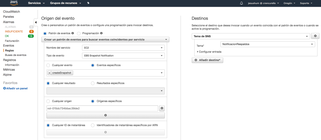 É importante mencionar que, nesse caso, as notificações serão enviadas pelo Tópico SNS criado algumas etapas antes e só serão executadas quando a Fonte corresponder, neste caso, os snapshots criados a partir do volume EBS selecionado no campo “Origens Específicas”.