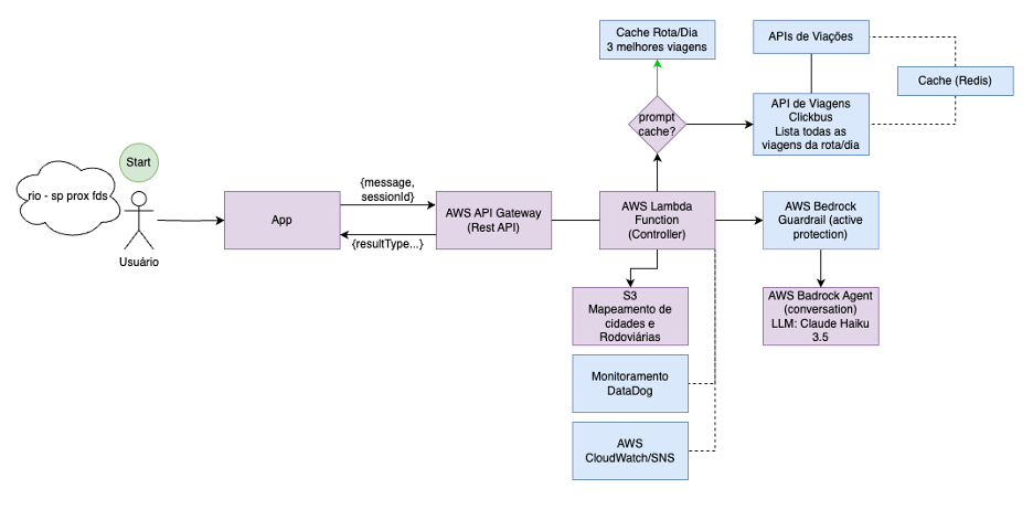 A versão final do BusBrain materializa o paradoxo da simplicidade eficiente. Os múltiplos agentes foram consolidados em um único agente conversacional otimizado, orquestrado por um AWS Lambda centralizado que gerencia tanto a lógica de cache quanto a integração com a API de viagens, serviços AWS e também com o DataDog, eliminando também a necessidade da base de conhecimento para contextualização.
