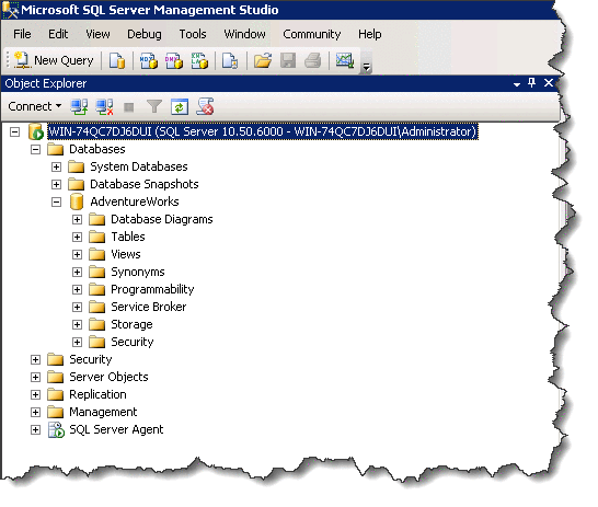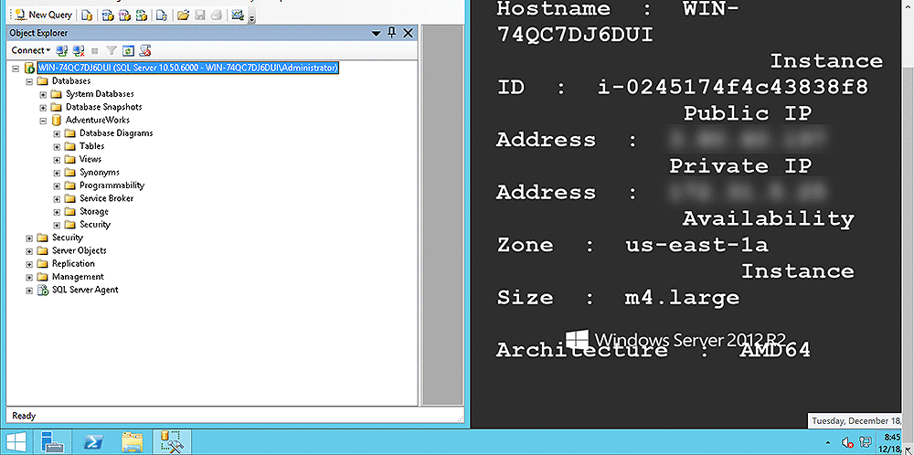 Para os propósitos deste exemplo, tenho uma instância do Windows 2008 R2 residente na minha conta da AWS. A imagem a seguir mostra minha instância como tendo também o SQL Server 2008 R2 SP3 instalado, com um banco de dados de exemplo do AdventureWorks. Após a conclusão desta automação, o AWS Systems Manager atualiza o sistema operacional para o Server 2012 R2. O SQL Server 2008 R2 permanecerá como está.