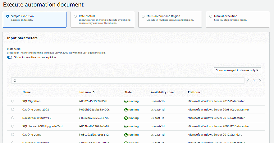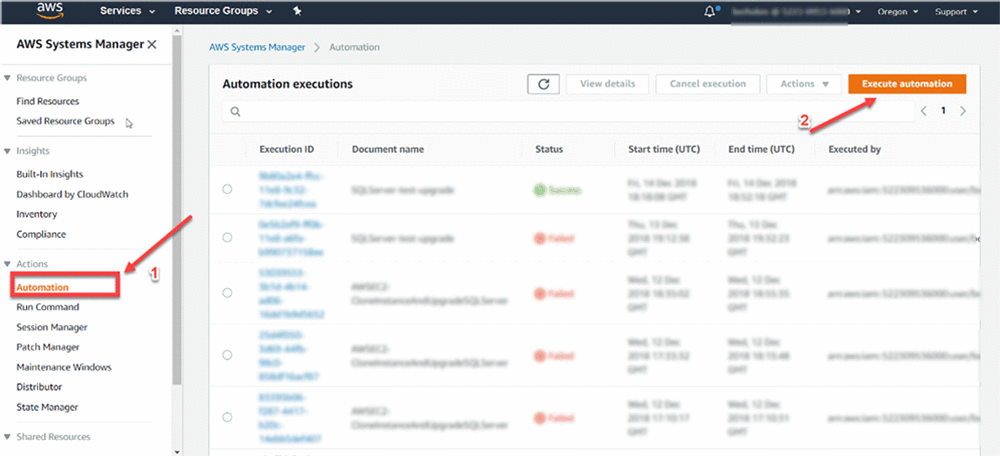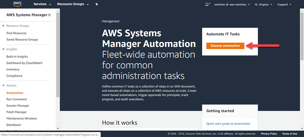 Depois que sua lista de Managed Instance for confirmada, navegue até a guia Automation no AWS Systems Manager e Execute automation: