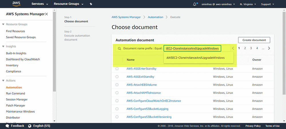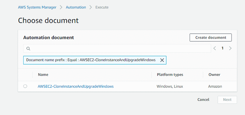 Filtre para o documento de automação AWSEC2-CloneInstanceAndUpgradeWindows na área de pesquisa.