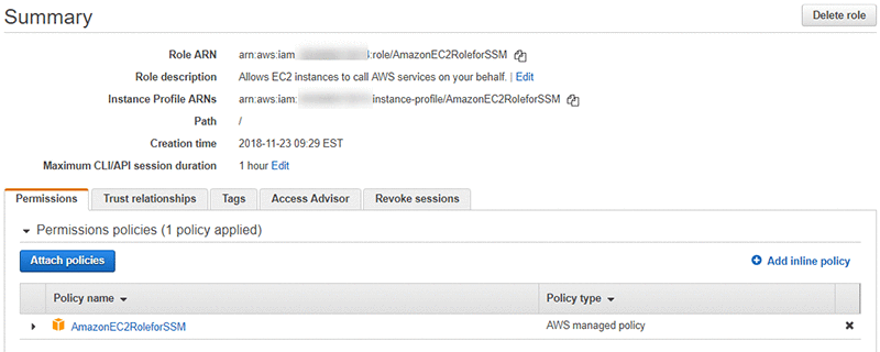 Este exemplo específico tem uma função chamada SSM-EC2-Profile-Role que possui a política AmazonEc2RoleSSM anexada à função. Por sua vez, essa função é anexada à instância. Isso permite que o serviço Systems Manager se comunique com a instância do EC2 e execute comandos nele depois de ser adicionado ao serviço do AWS Systems Manager.