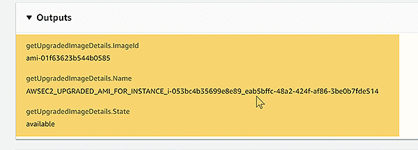 Após a conclusão da automação, a saída que você pode ver é a ID da AMI ( getUpgradeImageDetails.ImageId: ami-01f63 ******* ). Você pode iniciar a AMI para ver se o Windows está atualizado.