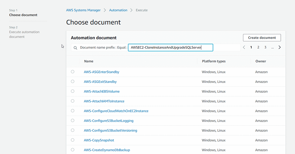 Para procurar o documento AWSEC2-CloneInstanceAndUpgradeSQLServer, vá para a barra de pesquisa, escolha Prefixo do nome do documento, escolha Equal e, em seguida, cole o nome do documento (AWSEC2-CloneInstanceAndUpgradeSQLServer). É importante observar que esse nome faz distinção entre letras maiúsculas e minúsculas, portanto, verifique se está correto.