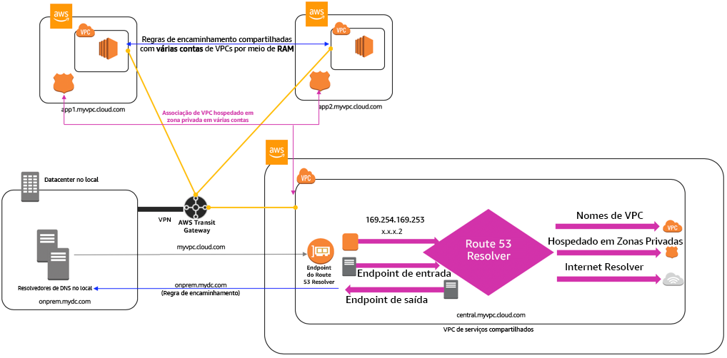 Para simplificar o DNS em todo esse ambiente híbrido, você pode implementar um DNS gerenciado centralmente que pode resolver nomes de DNS entre seu data center on-premises e as VPCs.