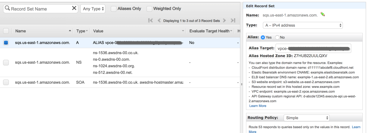 b. Crie um registro de alias chamado sqs.us-east-1.amazonaws.com direcionado ao nome de host DNS regional específico do endpoint (vpce-12345678-abcdefg.sqs.us-east-1.vpce.amazonaws.com).