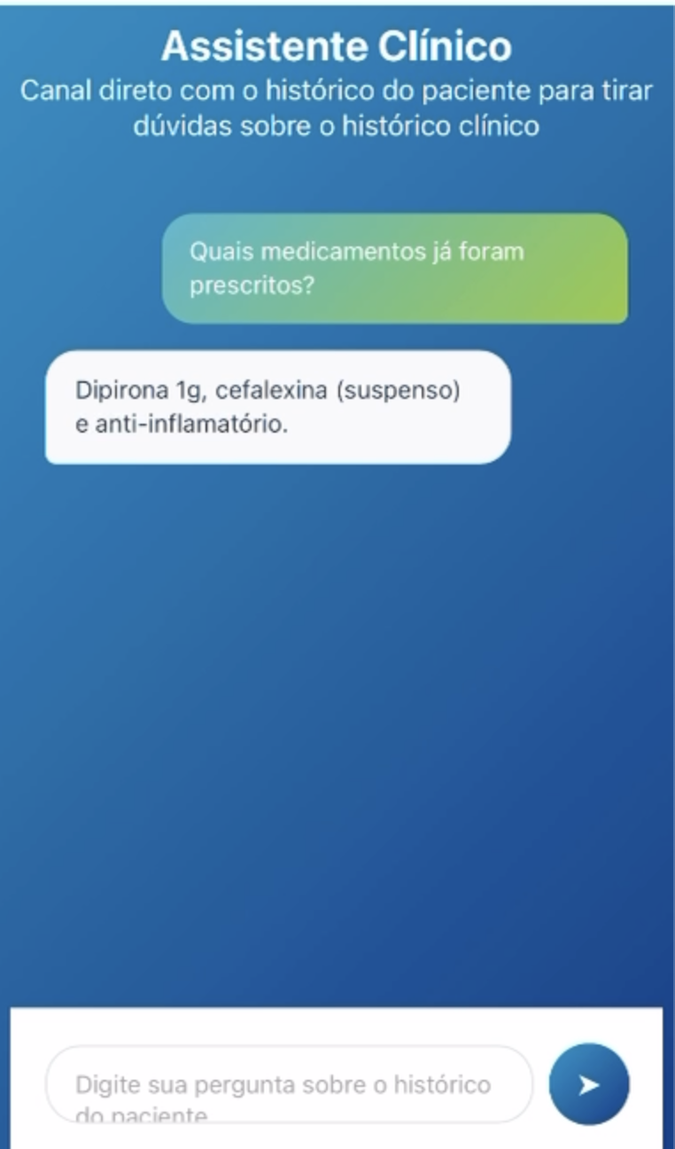 Para maximizar a efetividade das passagens de plantão, a solução inclui um chatbot assistente clínico inteligente que pode sumarizar as últimas anotações de evolução do paciente e responder perguntas específicas em tempo real, como “qual foi o último medicamento administrado ao paciente?” ou “quais foram os sinais vitais mais recentes?”. Esta funcionalidade permite que os profissionais acessem informações críticas instantaneamente, melhorando a continuidade do cuidado e a tomada de decisões clínicas.