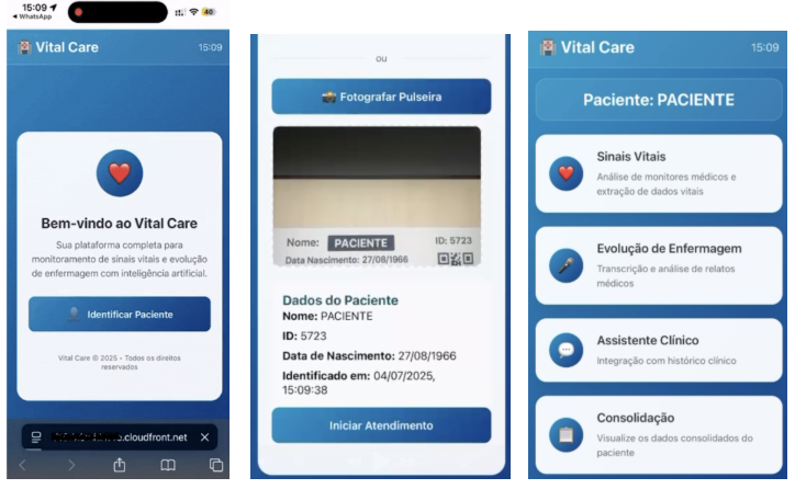 Na sequência, os sinais vitais são registrados de forma automatizada através de uma fotografia do monitor multiparâmetro, eliminando a necessidade de transcrição manual dos dados. Como etapa final da visita, o profissional pode gravar um áudio descrevendo a situação clínica do paciente, que é automaticamente transcrito e sumarizado pela solução. Este registro inclui o estado atual do paciente, queixas relatadas, necessidades de intervenção médica e toda a evolução assistencial que tradicionalmente seria anotada no sistema de prontuário eletrônico