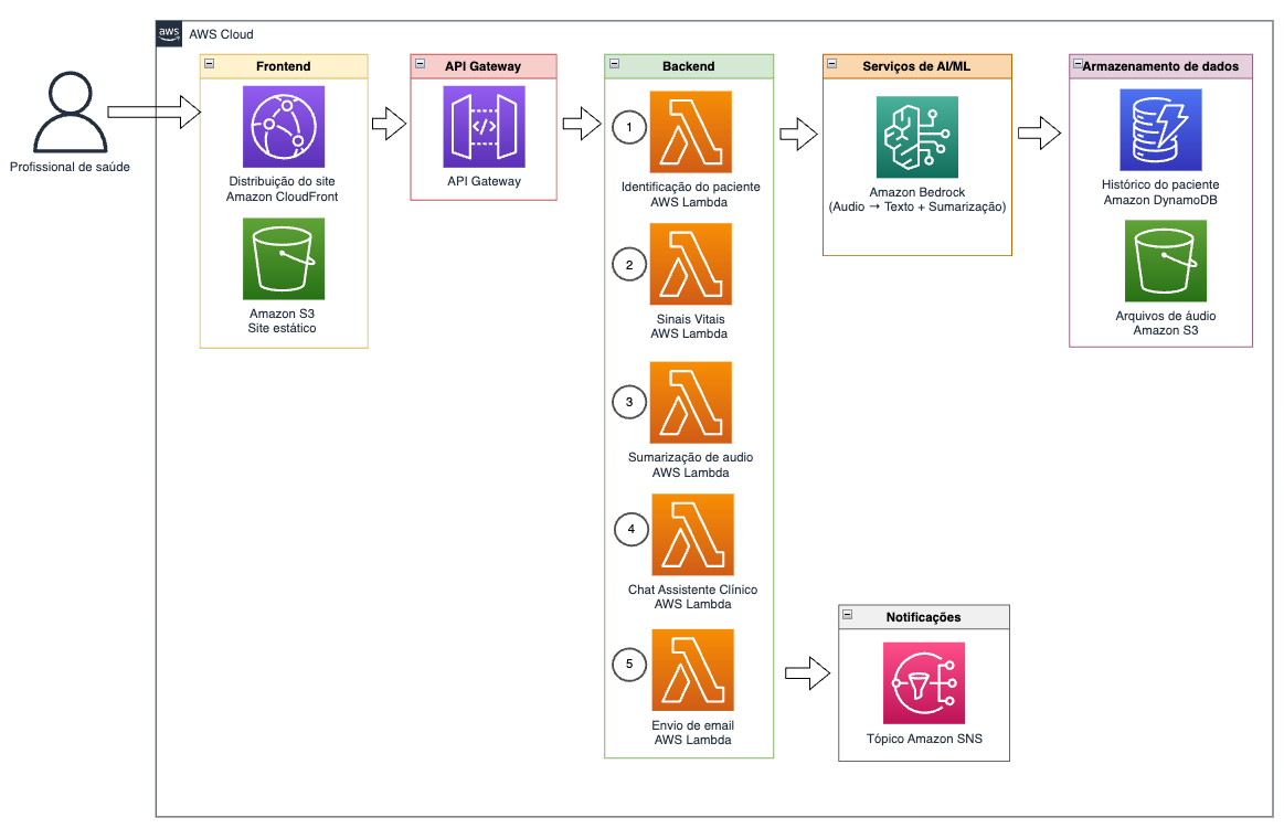 Para criar essa solução, utilizamos alguns serviços listados abaixo, entre eles dois de inteligência artificial: o Amazon Q Developer, uma IA especializada em auxiliar desenvolvedores em suas tarefas diárias, e o Amazon Bedrock, um serviço totalmente gerenciado que disponibiliza diversos modelos de base (FMs) de alta performance para implementação de IA generativa. Essa solução elimina trabalho repetitivo, garante que nenhuma informação importante seja perdida e permite que os profissionais de saúde se concentrem no que realmente importa: o cuidado com os pacientes.
